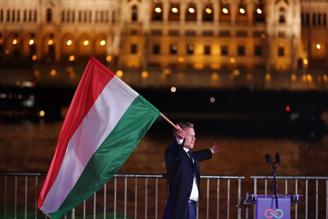 匈牙利蒂萨党并吞东说念主毛焦尔·彼得在胜选晚会上挥舞匈牙利国旗。新华社 发
