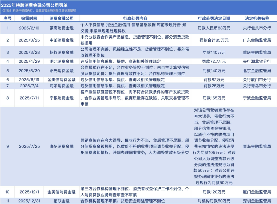 据《财经》新媒体统计,2025年,捏牌虚耗金融公司共收到11张罚单。其中,宁银虚耗金融、阳光虚耗金融、招联金融、中邮虚耗金融、金好意思信虚耗金融的处罚事由,均提到合营模式、合营机构、合营贬责等相关事项。