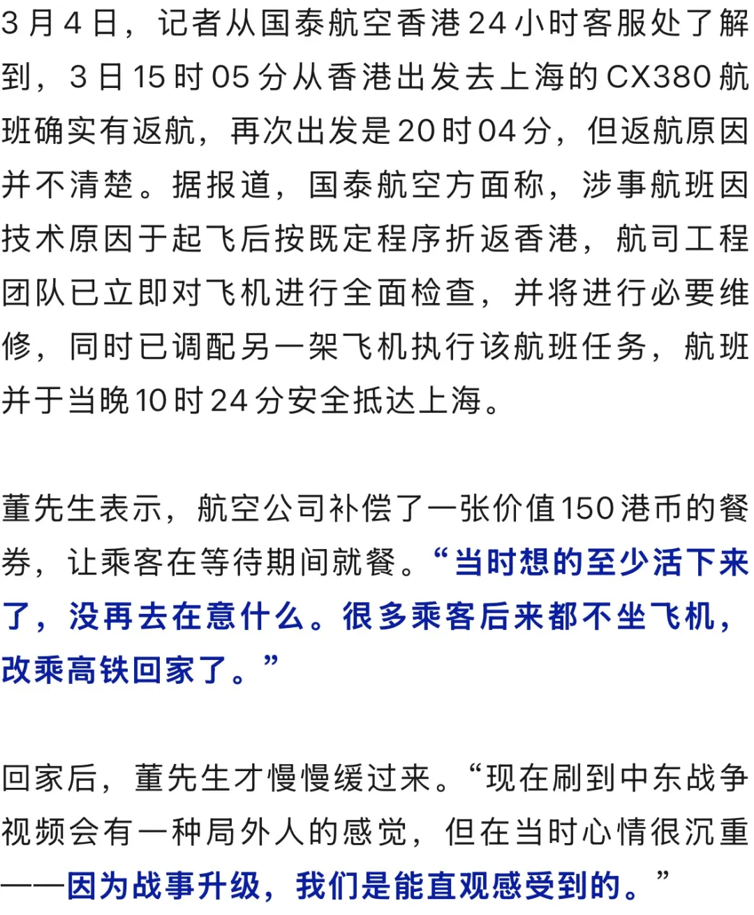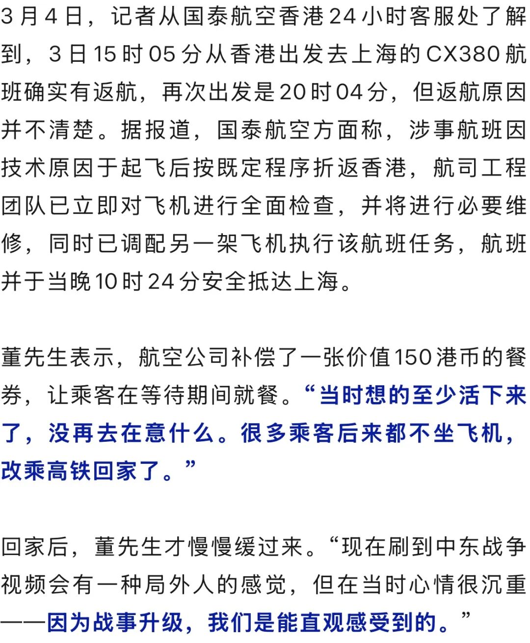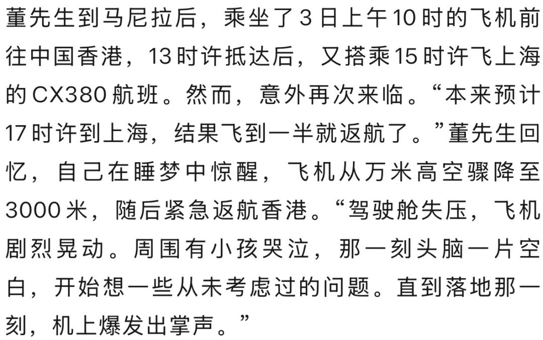 3月3日,上海的董先生在酬酢平台共享了一段号称“践诺版慌乱大片”的归国履历:先是放洋旅游返程改动时因中东局势突变淹留沙特3天,亲历了一百公里外的导弹轰炸、领空关闭;好浮松易经菲律宾改动回到中国,又在香港飞往上海的CX380航班上履历驾驶舱失压、飞机热切返航,广瑞网配资一起障碍束缚。他自嘲为“先天渡劫圣体”。
