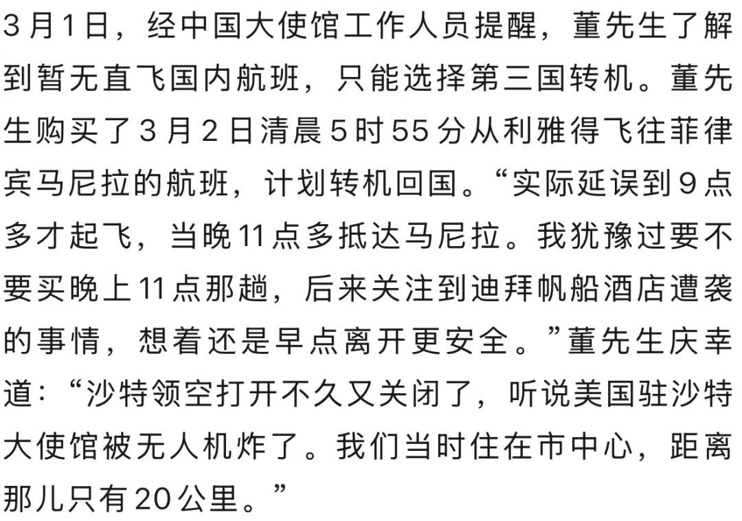 “伊朗把好意思军驻利雅得的基地炸了,距离咱们唯一100公里傍边。”董先生回忆,2月28日上昼得知好意思以对伊朗发动打击时,并未思到会影响我方的行程,直到下昼收到航班取消的音尘,才阻塞到情况的严重性。“我第一反映是干系航空公司改签,第二步是干系购票平台,但电话全被打爆,根柢打不进去。”