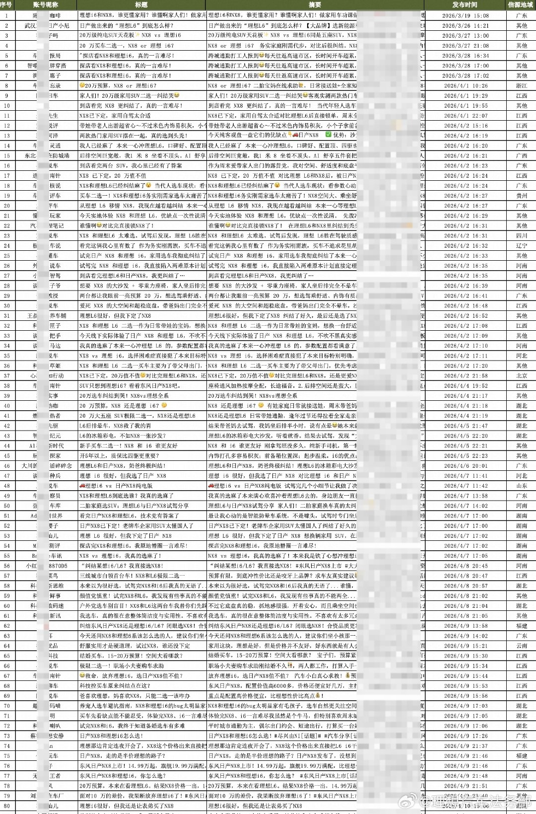 界面新闻记者在酬酢平台检索发现,对于东风日产NX8与理念念i6、L6的对比帖数目不少。联系内容多以对比为名,教唆用户转向购买NX8,评述区内也出现“终末照旧选拔NX8”等相似回复。在李念念公拓荒声后,部分帖子已删除,或对波及理念念i6、L6的内容进行了修改。