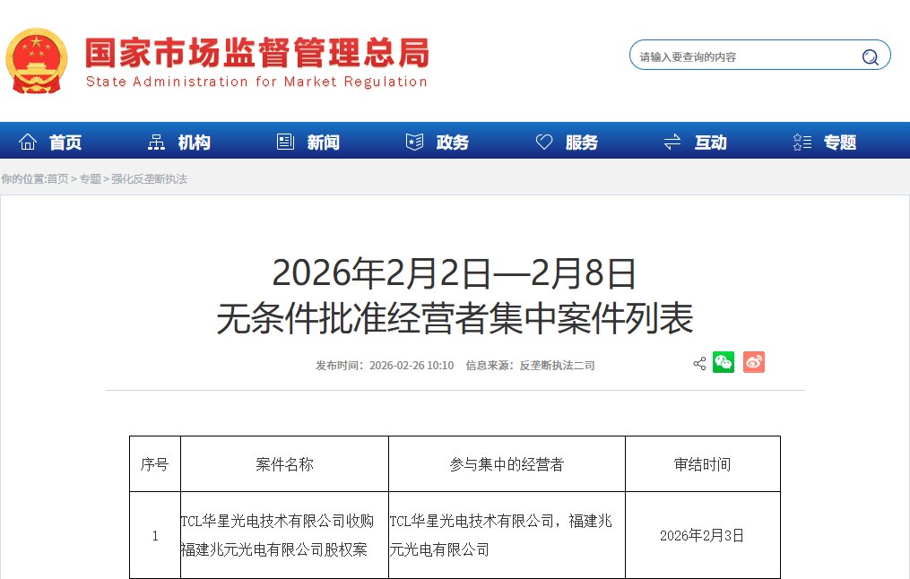 上证报中国证券网讯(记者 邹传科)2月27日,记者从TCL科技获悉,国度市集监督搞定总局日前发布的《2026年2月2日-2月8日无条目批准谋略者斟酌案件列表》涌现,TCL科技子公司TCL华星光电时间有限公司(以下简称“TCL华星”)收购福建兆元光电有限公司(以下简称“兆元光电”)股权案已获无条目批准,认真通过反把持审查。