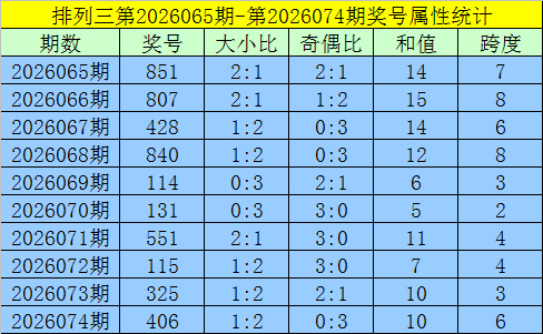 上期纪念:枚举三第2026074期出现奖号406。开出组六,奇偶比0:3,012路比2:1:0,大小比1:2,和值10,跨度6。