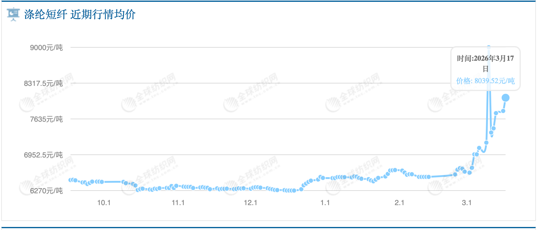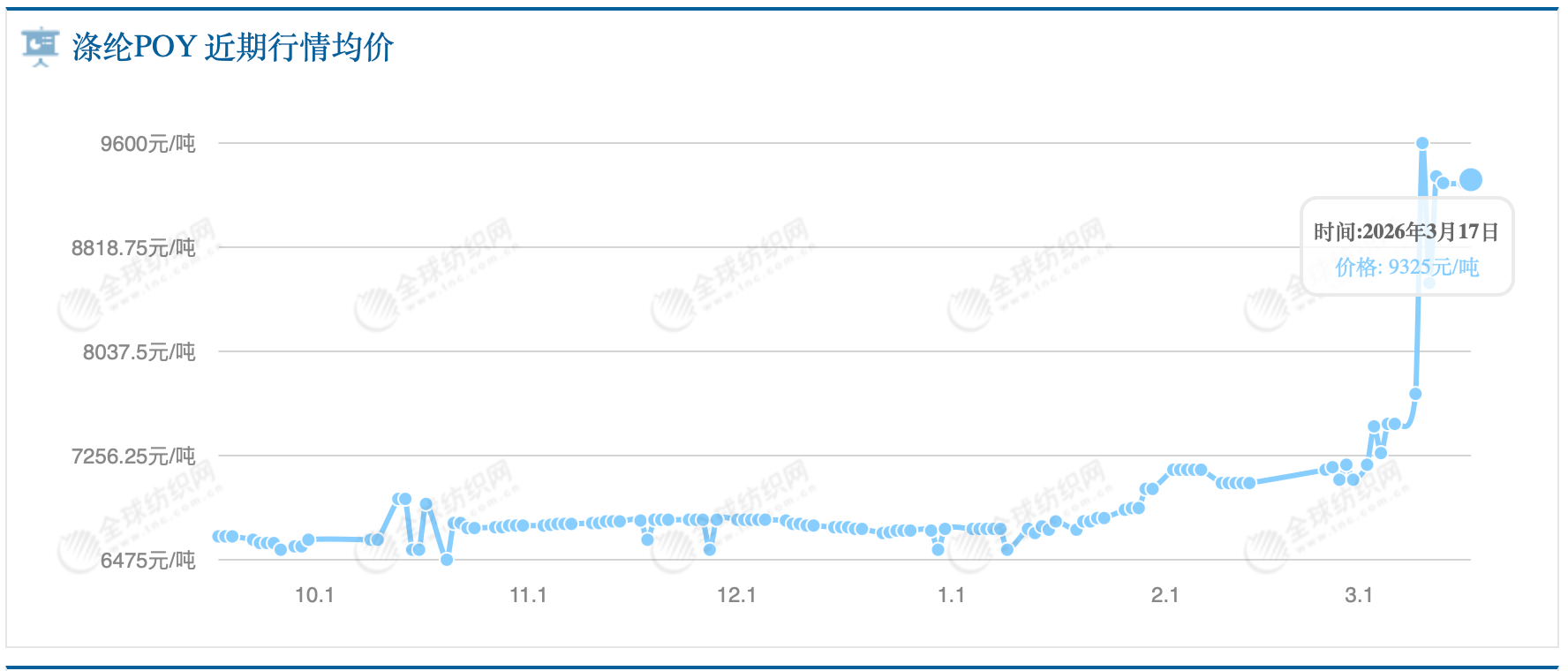 以涤纶纤维中一种主要居品类别“涤纶POY”的行情为例,据全球纺织网数据,该居品报价从本年1月底开动渐渐走高,毒害7000元/吨;参加3月后急剧上升,到3月10日一度达到9600元/吨。为止3月17日,其报价仍保抓在高位,为9325元/吨。