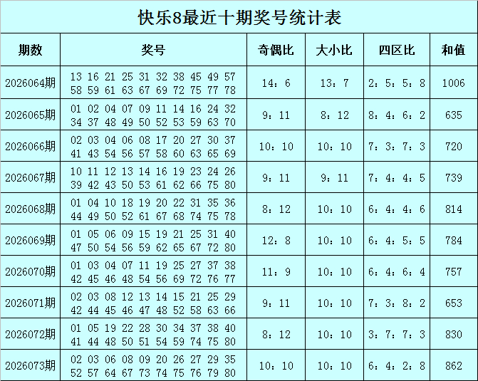 福彩快意8第2026073期开奖追思:02 03 06 08 09 20 26 27 29 35 52 57 64 67 73 74 75 76 79 80,其中奖号四区比为6:4:2:8,奇偶比为10:10,大小比为10:10,和值为862。